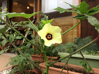 【お店の前でオクラの花が咲きました】 ご縁でいただいた野菜の苗たちが実をつけ始めています。 うれしいのは、開店時(訳3年前)にいただいたオリーブもついに実をつけ始めていること。 オリーブの塩漬けができるくらいなるとよいのだけど( *´艸`) オクラはきれいな花を咲かせます。 実ができてきていても、なかなか見れずにいた花。 やっと、拝むことができました!